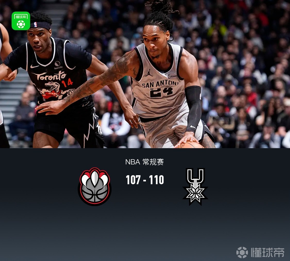 第四节猛龙珀尔特尔拿下6分,马刺福克斯拿下8分,最终猛龙107-110不敌马刺