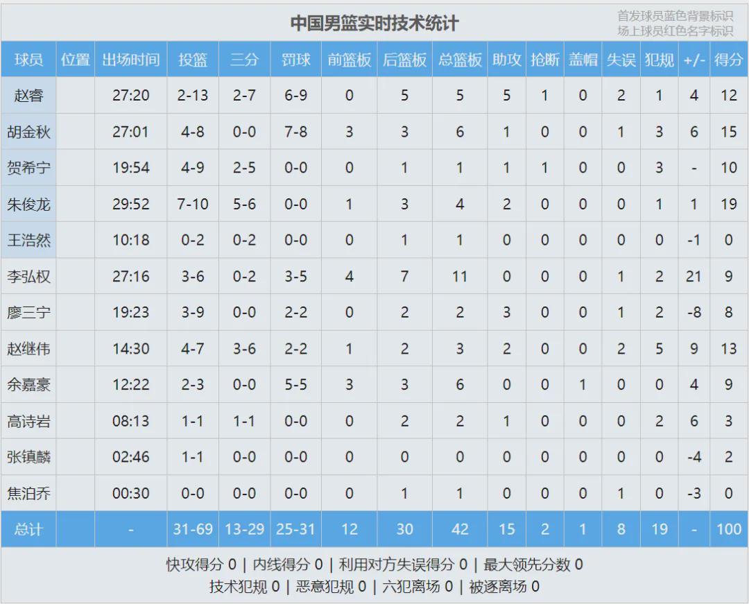 中国男篮连续两场完成逆转!朱俊龙10投7中,其中三分6中5,得到19分4篮板2助攻,希望他的伤势没有大碍。胡金秋15分6板、赵继伟13分3板2助、赵睿12分5板5助、贺希宁10分、李弘权9分11板、余嘉豪9分6板。
