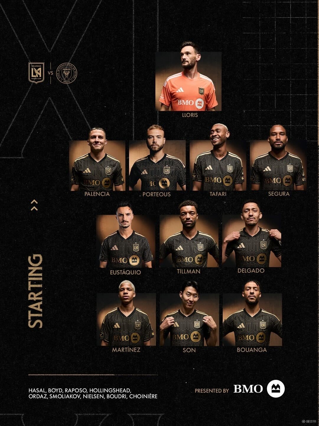 洛杉矶首发:1-洛里、4-塞古拉、5-波蒂厄斯、91-伯吉斯、14-帕伦西亚、8-德尔加多、46-欧斯塔基奥、11-蒂尔曼、99-布安加、7-孙兴慜、30-戴维-马丁内斯