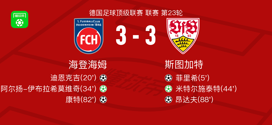 北京时间2月23日德国足球顶级联赛 联赛 第23轮,海登海姆主场对阵斯图加特。海登海姆迪恩克吉破门,康特破门,阿尔扬-伊布拉希莫维奇破门。斯图加特菲里希破门,昂达夫破门,米特尔施泰特破门。最终比分海登海姆 3-3 斯图加特。