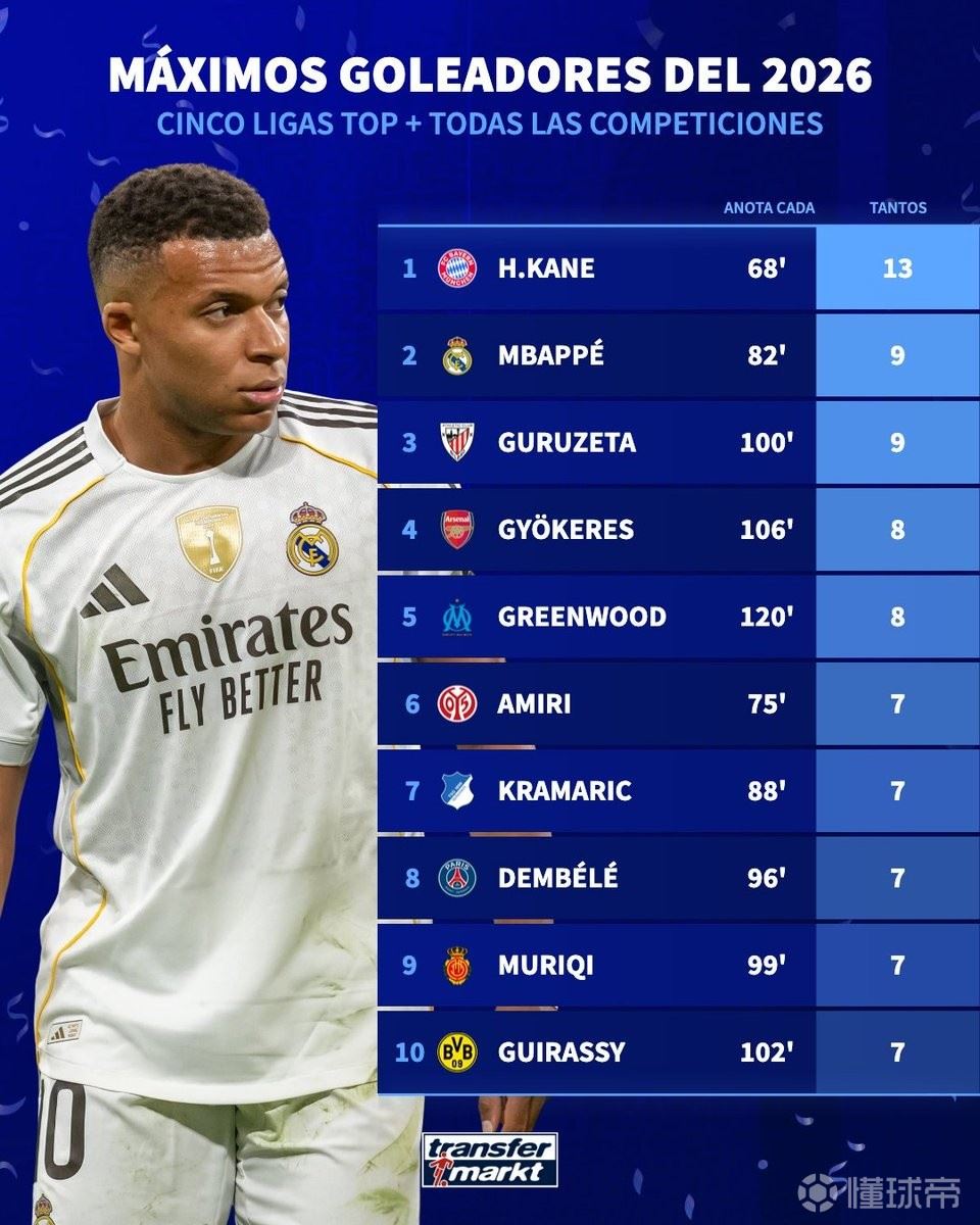 北京时间2月24日,德转统计出了2026年至今欧洲五大联赛球员各项赛事的进球榜,哈里-凯恩以13球排名第一,姆巴佩9球位列第二,哲凯赖什、格林伍德、登贝莱以及吉拉西上榜。