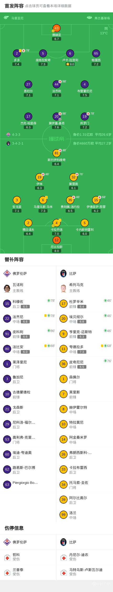 北京时间2月24日意大利足球甲级联赛第26轮,佛罗伦萨主场对阵比萨。比赛中莫伊塞-基恩首开纪录,打入本场比赛唯一进球,最终佛罗伦萨1-0战胜比萨。