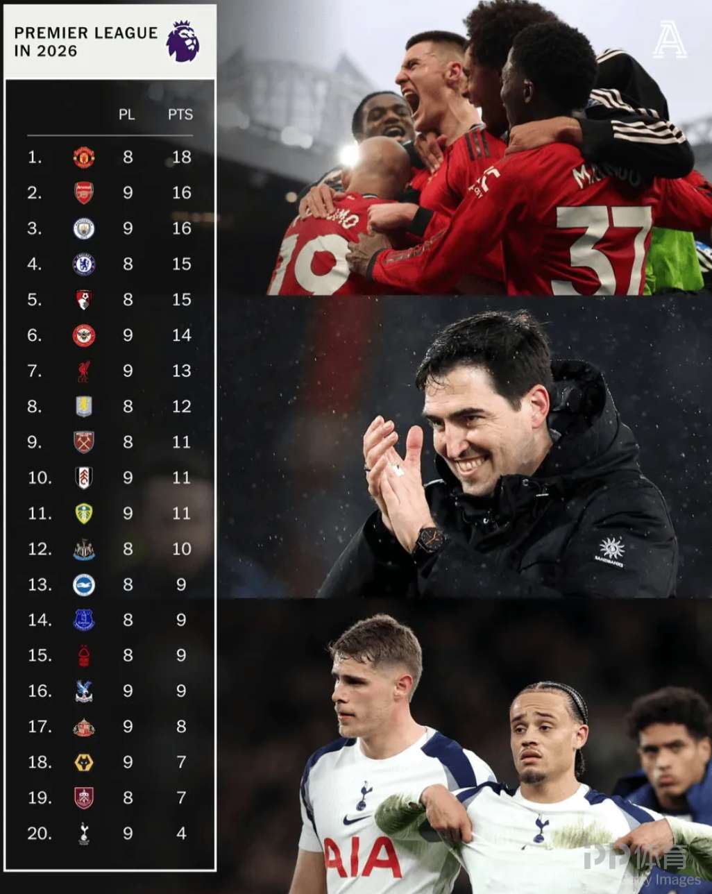 英超“2026自然年”积分榜更新:曼联以8场18分领跑,同时也是2026年以来联赛唯一保持不败的球队。身后阿森纳、曼城同为9场16分紧追,热刺仅拿到9场4分排名垫底,并且是2026年英超唯一仍未取胜的球队。