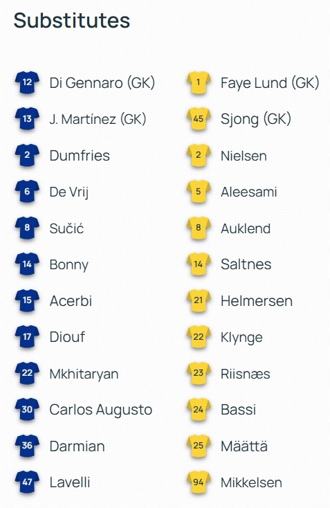 替补:12-迪詹纳罗、13-何塞普-马丁内斯、2-邓弗里斯、6-德弗赖、8-苏契奇、14-博尼、15-阿切尔比、17-迪乌夫、22-姆希塔良、30-卡洛斯-奥古斯托、36-达米安、47-拉韦利