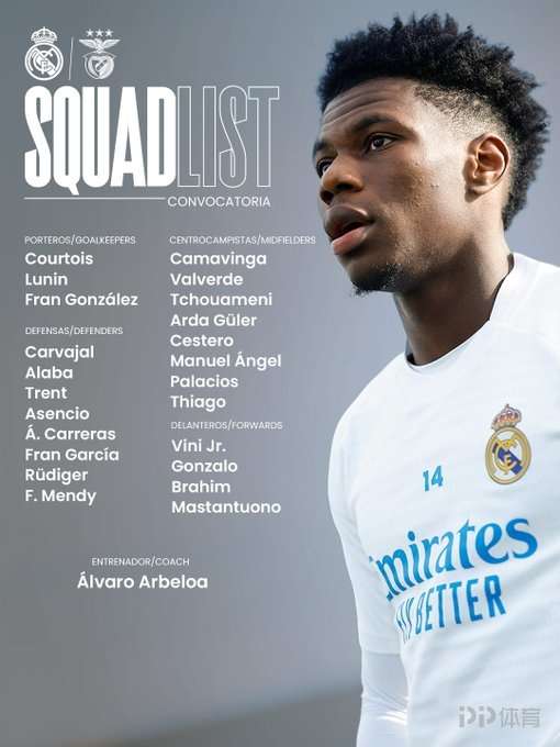 皇马公布欧冠淘汰赛附加赛次回合战本菲卡大名单,维尼修斯领衔,姆巴佩、赫伊森因伤缺席。