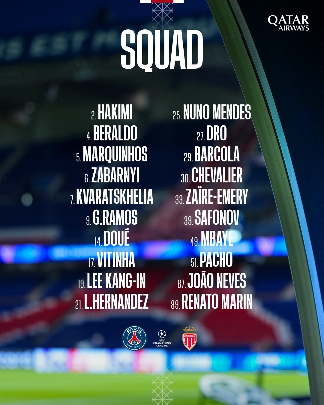 欧冠淘汰赛附加赛次回合,大巴黎将在主场对阵摩纳哥,赛前,大巴黎官方公布了本场比赛大名单,