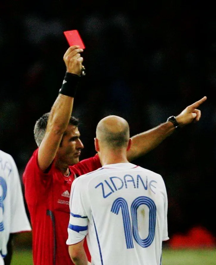 当值主裁判(阿根廷人埃利松多)经过第四官员梅迪纳-坎塔莱霍(西班牙)的提醒,将齐达内红牌罚下。