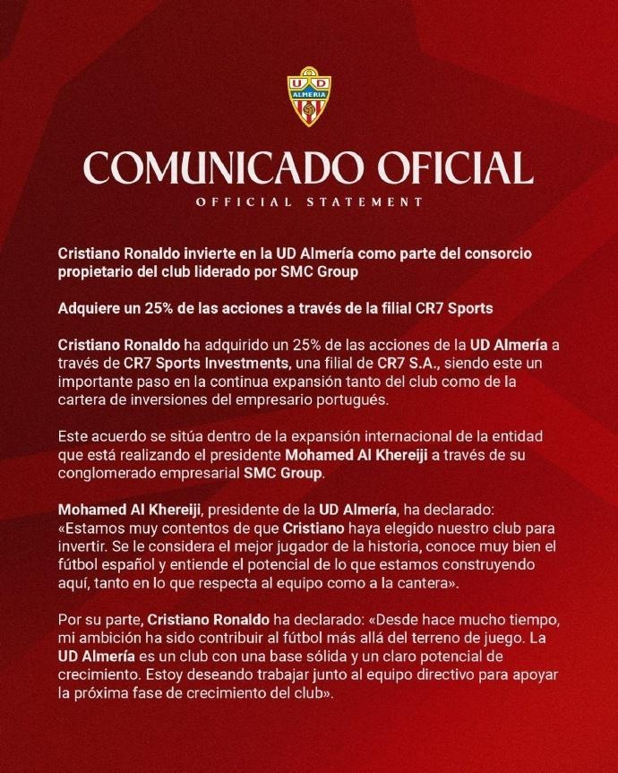 周四,C罗发表声明表示收购西乙俱乐部阿尔梅里亚25%的股份。