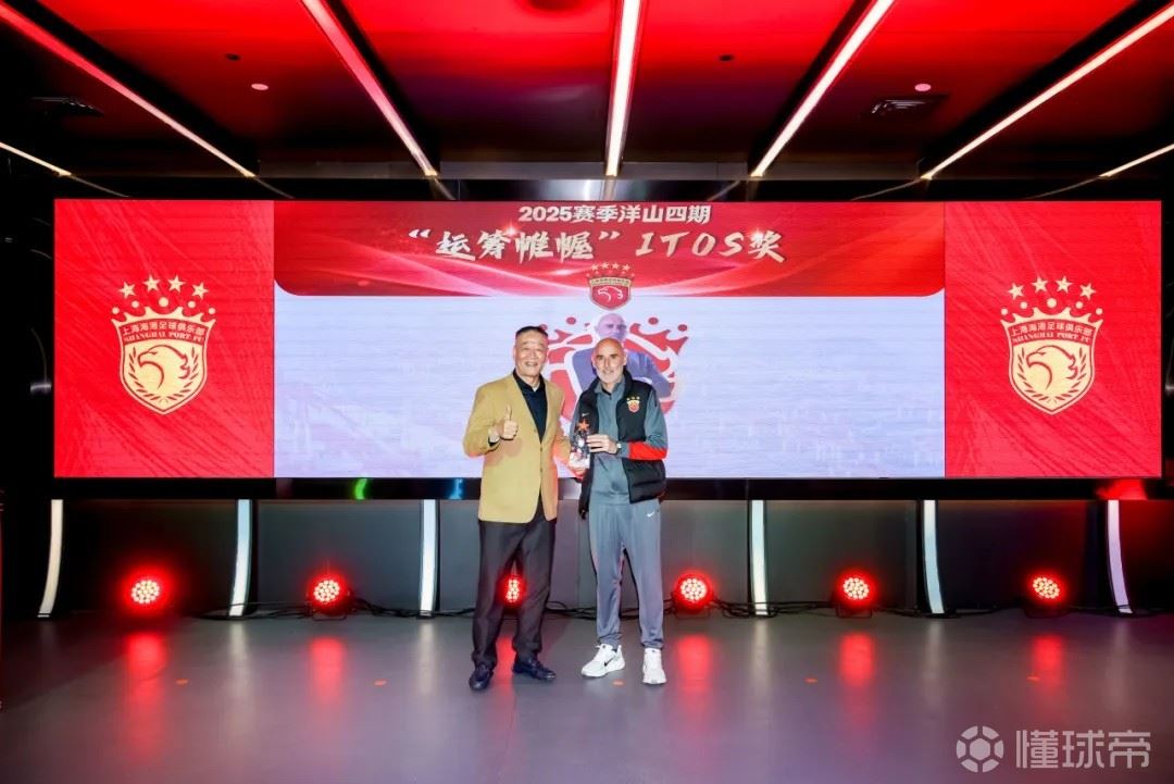 上港集团全国劳模黄华为吾米提江、李新翔、蒯纪闻颁发“迭代升级”新秀奖,上海市足协主席柳海光为主教练穆斯卡特颁发“运筹帷幄”ITOS奖。
