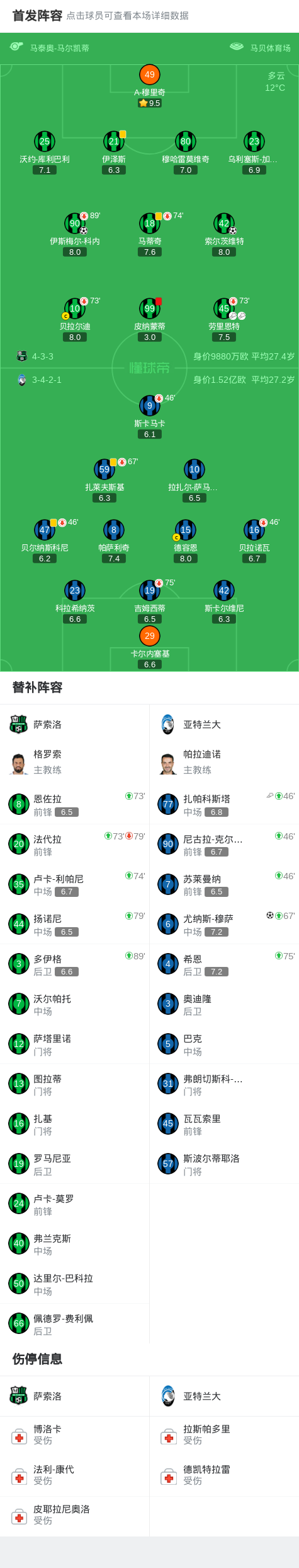 第88分钟,扎帕科斯塔助攻,穆萨推射破门扳回一分,亚特兰大1-2萨索洛