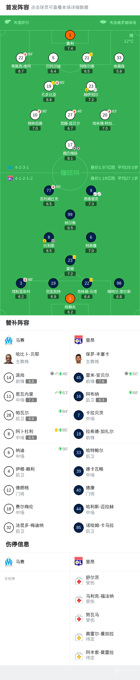 北京时间3月2日法国足球顶级联赛 联赛 第24轮,马赛主场对阵里昂。马赛派尚破门,奥巴梅扬梅开二度。里昂托利索破门,雷米-安贝尔破门。最终比分马赛 3-2 里昂。