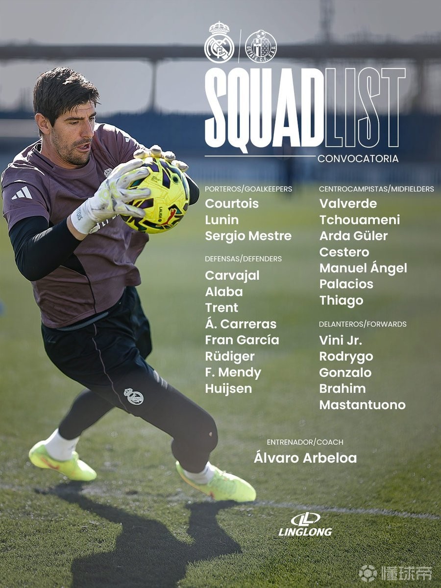皇家马德里官方公布了西甲第26轮主场对阵赫塔费的比赛大名单,姆巴佩、卡马文加缺阵,赫伊森回归。
