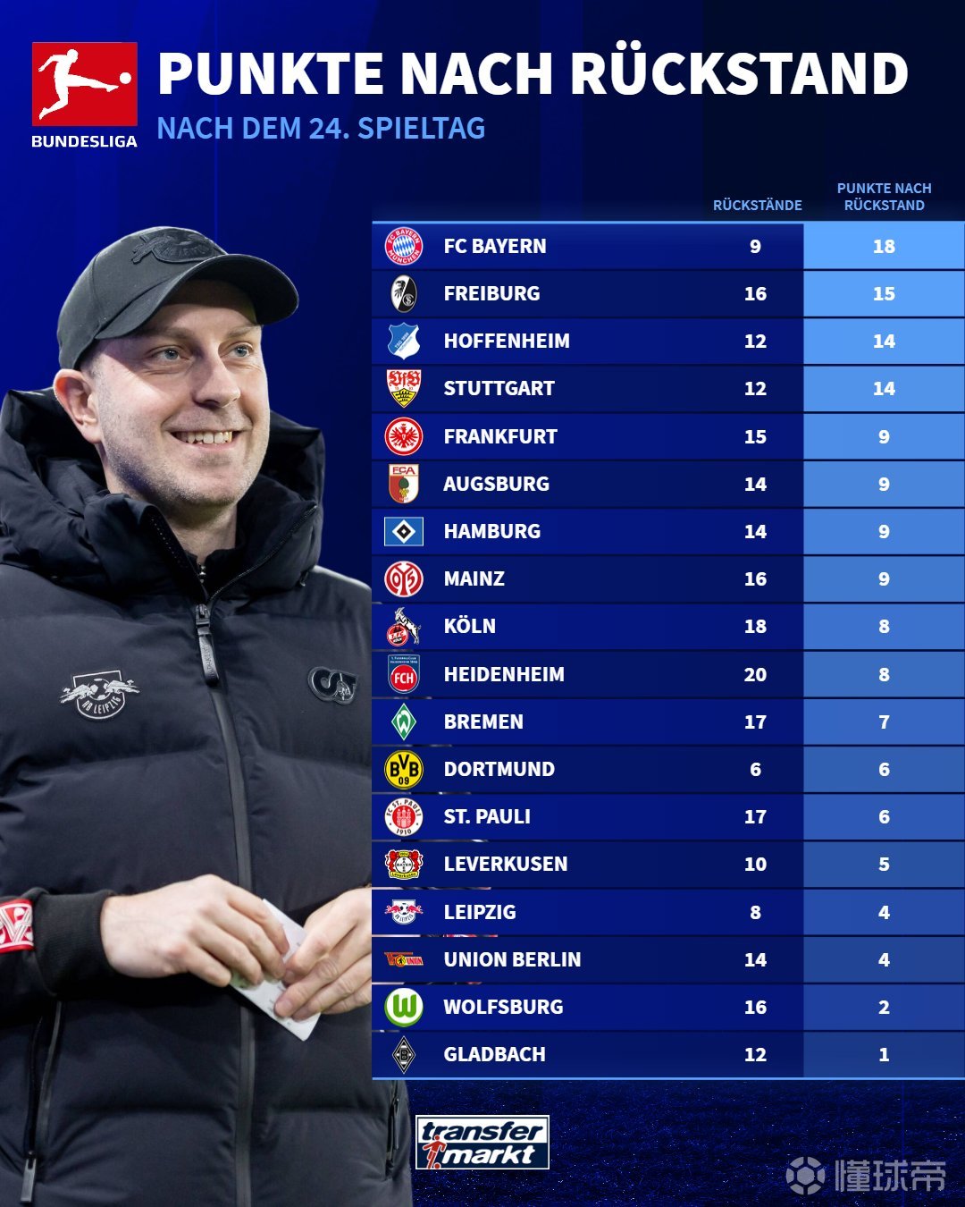 德甲本季逆转积分排行榜:拜仁居首、弗赖堡次席,莱比锡首次逆转取胜