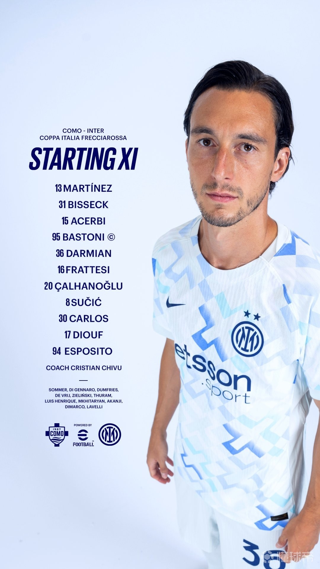 国际米兰首发:13-何塞普-马丁内斯、31-比塞克、15-阿切尔比、95-巴斯托尼、36-达米安、16-弗拉泰西、20-恰尔汗奥卢、8-苏契奇、30-卡洛斯-奥古斯托、17-安迪-迪乌夫、94-皮奥-埃斯波西托